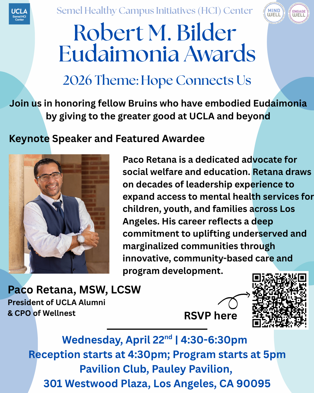 - Eudaimonia Award Ceremony: Wednesday, April 22, 2026, 4:30–6:00 pm (Pauley Pavilion Club)