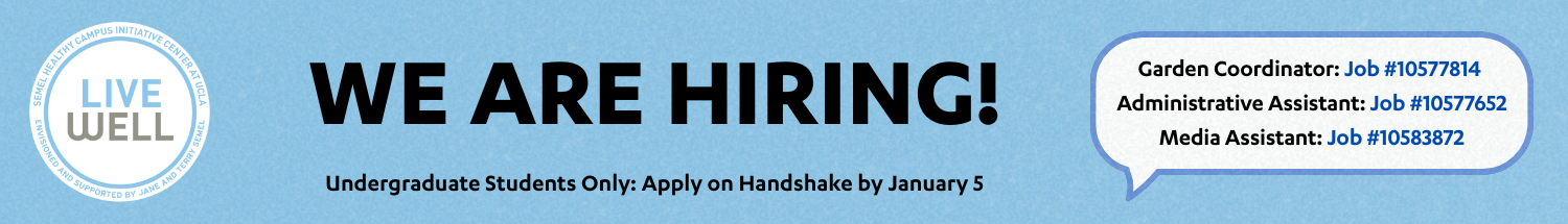 The Semel Healthy Campus Initiative (HCI) Center envisions UCLA as the healthiest campus in the country. By identifying existing strengths across our campus and bringing individuals together around a common goal, Semel HCI Center has created an infrastructure to collaborate and rapidly translate research into practice. In doing so, we aim to cultivate a flourishing community in which all Bruins can thrive, and where health and well-being are woven into the very fabric of the university.