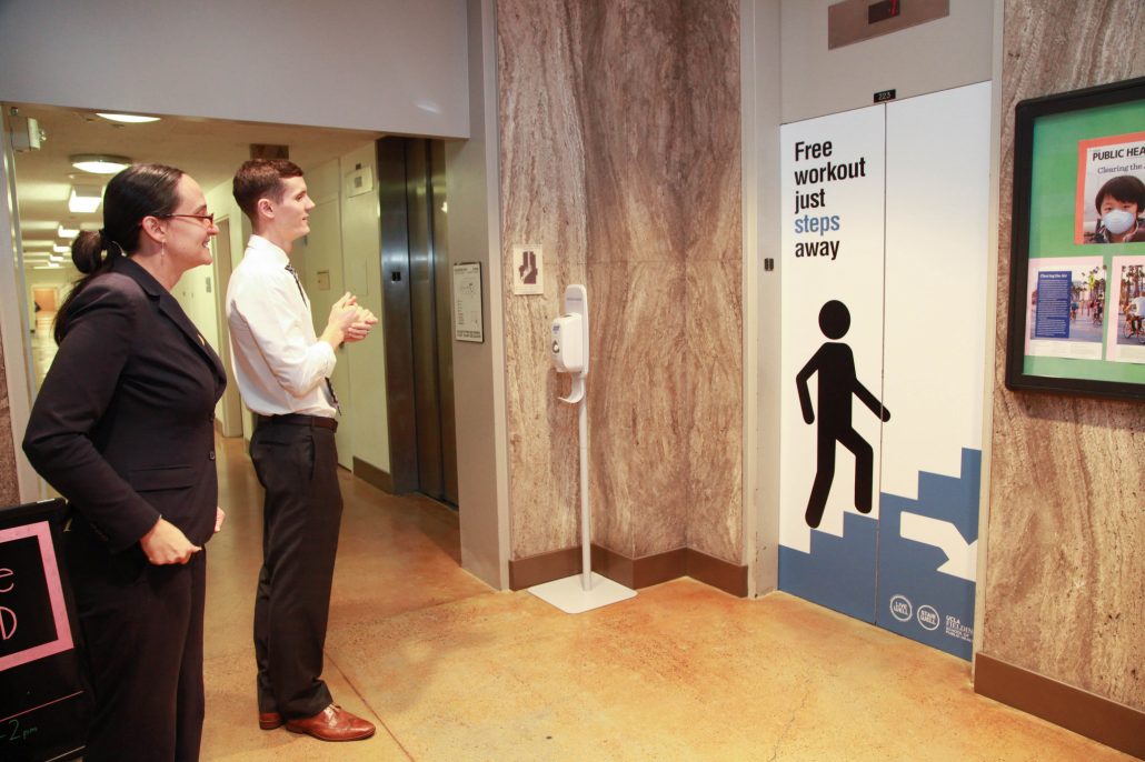 In the Spring of 2014, the installation of several “Take the Stairs” placards marked the beginnings of a years-long effort to activate the main stairwell in the Fielding School of Public Health (FSPH)
